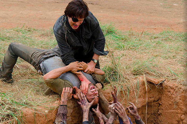 Daryl comes across the undead Merle feeding on Ben, at the meeting place, and begins to cry uncontrollably. Daryl pushes him back three times, before stabbing Merle in the shoulder, knocking him to the ground. He finishes the undead Merle by stabbing him multiple times in the face, falling to the ground in tears.