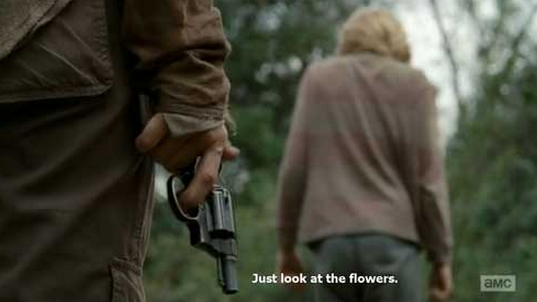 Lizzie kills her sister Mika, but is stopped short of killing baby Judith by Tyreese and Carol. Upon realizing that no one is safe around Lizzie due to her inability to perceive the difference between the living and the dead, Carol takes Lizzie out under the ruse of picking flowers for her sister Mika. Believing that Carol was mad at her for an incident involving her pointing a gun at Carol earlier, Lizzie begins to cry, and Carol tells her “look at the flowers”, which was what Mika told Lizzie to do earlier in the episode in order to calm down. An emotionally distraught Carol lifts her gun, and fires a fatal shot into the back of Lizzie’s head.