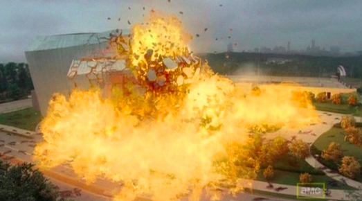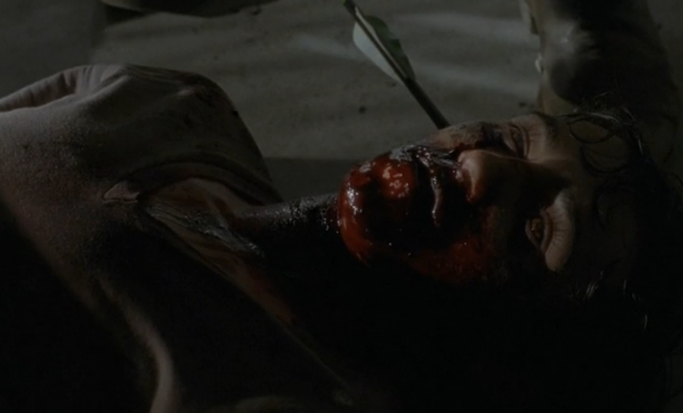 As The Governor beats up Rick, Michonne sneaks behind him and impales him through his chest with her sword. However, she decides not to put him down and leaves him to die in agony.