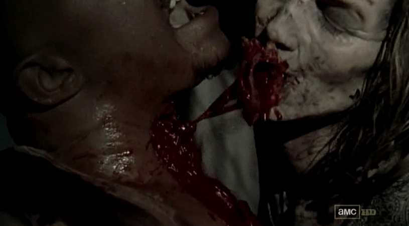 Andrew lured walkers into the prison, causing them to attack Rick and his group. T-Dog attempted to close the gate, but as he did so he was bitten, so he then ran off to safety with Carol. While wandering through the prison they ran into two walkers, and knowing his time was up, he used his last moments to save Carol’s life. He charged himself at the Walkers, holding both of them back, giving her time to escape, before a chunk of his throat was ripped out, leading to his death. T-Dog was later seen by Rick, devoured and still being eaten when encountered. Rick killed the walkers eating T-Dog, and couldn’t bear to look.