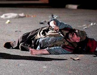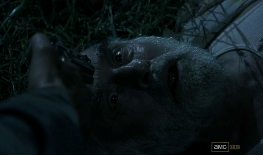 A walker that Carl had previously been examining in the marshy lands near Hershel’s farm, freed itself after Carl provoked it while its legs were trapped, and wandered onto the property. Dale later patrols the grounds and stumbles upon a cow that has died. After hearing something behind him, Dale turns around to see the same walker that Carl had seen earlier. It attacks him and, although he was able to prevent himself from being bitten, the walker rips open Dale’s stomach. Daryl comes to his rescue and killed the walker. The rest of the group reaches the dying Dale, bleeding from his wounds. Rick demands that they move Dale to the house to operate on him, but Hershel informs him that he would be unable to save Dale in his critical condition. Carl, upon seeing the walker, realizes that he is partly responsible for what happened, and cries.